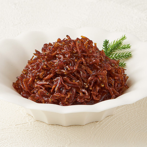 だしの素材としても活躍する椎茸と国産昆布を合わせた佃煮。椎茸の旨みが昆布にしみ込み、昆布の旨みで椎茸の美味しさがグンと増しています