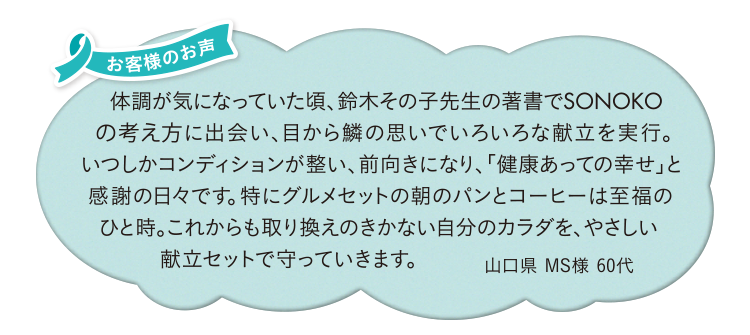 カラダに必要な栄養を円滑に補給できるSONOKO式献立で、中からスッキリ健やかに整えましょう。