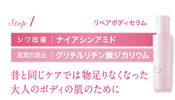 顔の肌と同じように年齢を重ねているのに、お手入れをつい怠ってしまうボディの肌にまず届けたいのは、エイジングケア美容液「リペアボディセラム」です。有効成分ナイアシンアミドがシワを改善、色素沈着を防ぎ、白く輝くハリ肌を育みます。