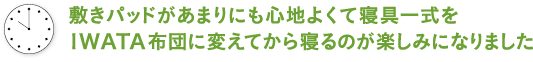 子どもと一緒に入浴することで、22時就寝 → 6時起床のリズムをキープ。寝る前はスマホを見ない時間をつくり、目と頭を休めています。敷きパッドから使い始めたIWATA布団は、あまりの心地よさに感動して今は寝具一式を愛用中。