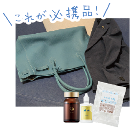 「SONOKO GG」「荘水」「ちゅらしお飴」は必ず鞄の中に。いろんなものに入れる「荘水」は、約3秒間を目安に滴下。出張時は「氷温®熟成そのこ米ごはん」と「ノンオイル調理 マイルドチキンカレー」などの常温レトルトを持参します。