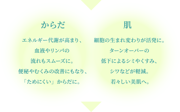 からだの負担となるものを取り除くことで代謝が活性化し、効率的にエネルギーを消費。摂取した栄養をきちんと使いきることが可能になります。