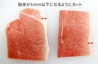 加工作業には、肉の厚さや脂肪の取り除き方、重量など、商品ごとに細かく規定が定められています。たとえば、脂身が5mm以下になるようにカットする、脂身が多過ぎるものは使用しない、脂身は手作業で削いで落とす、パックに詰める時は脂が多い部分と少ない部分をバランスよく入れる、重量合わせの小さいピースは2つまでしか入れてはならない等、これらの規定を厳格に守り、厳しい品質管理がされています。