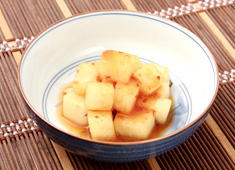 - 1.大根は好みの大きさにカットし、分量の塩を加え水気が出るまで塩もみし、出てきた水分をきる。